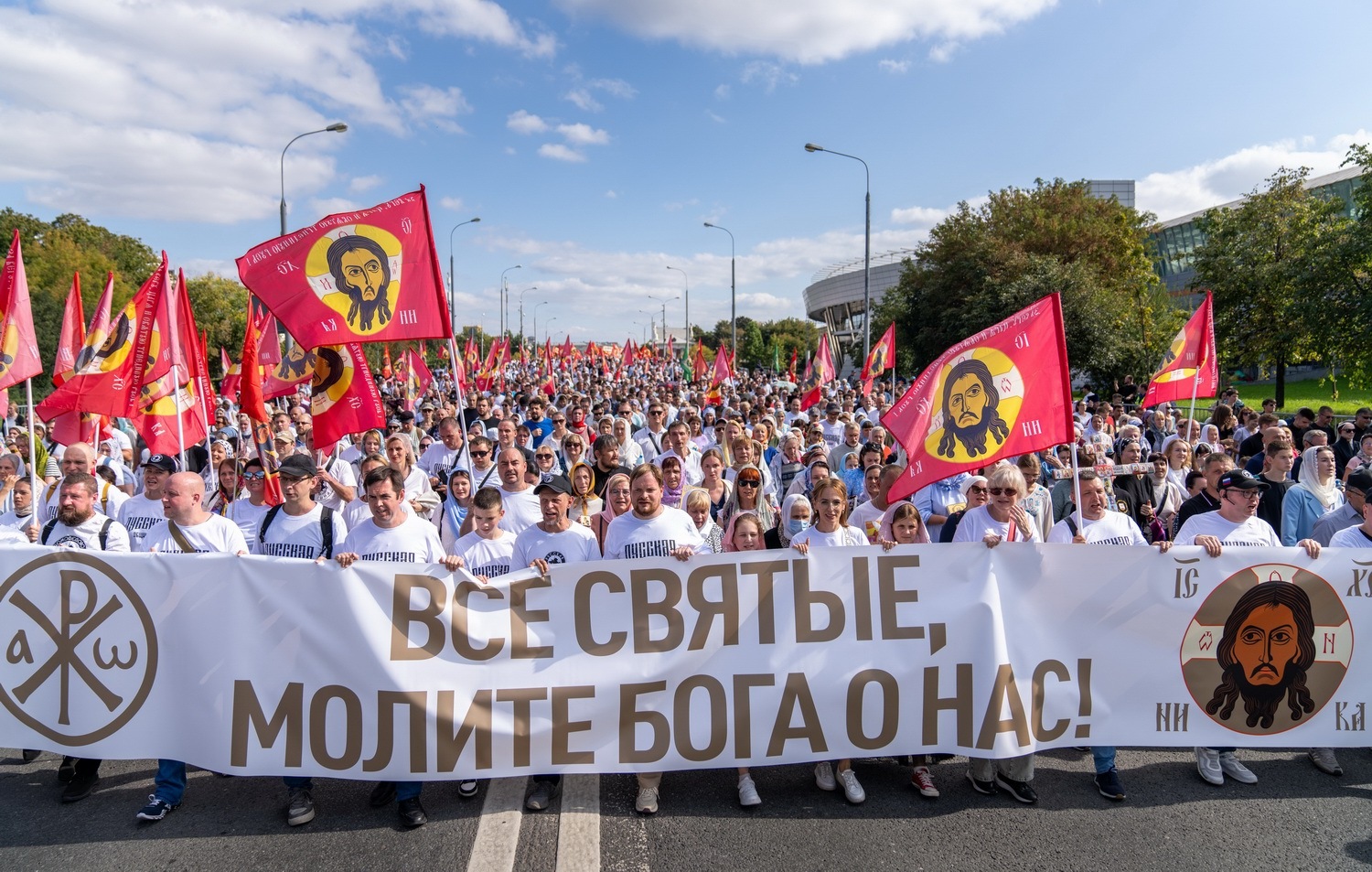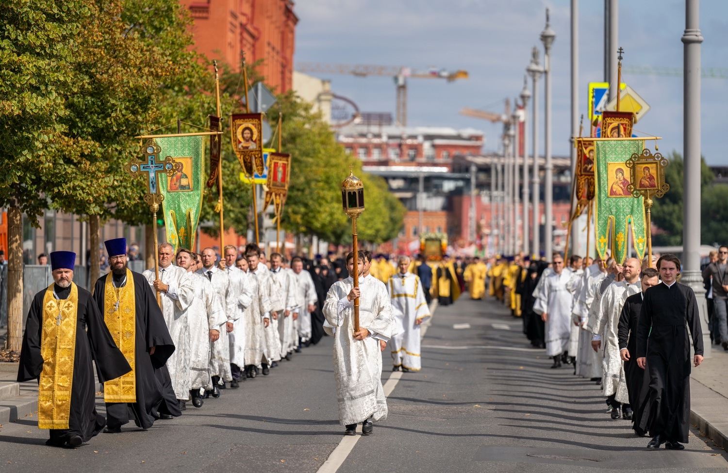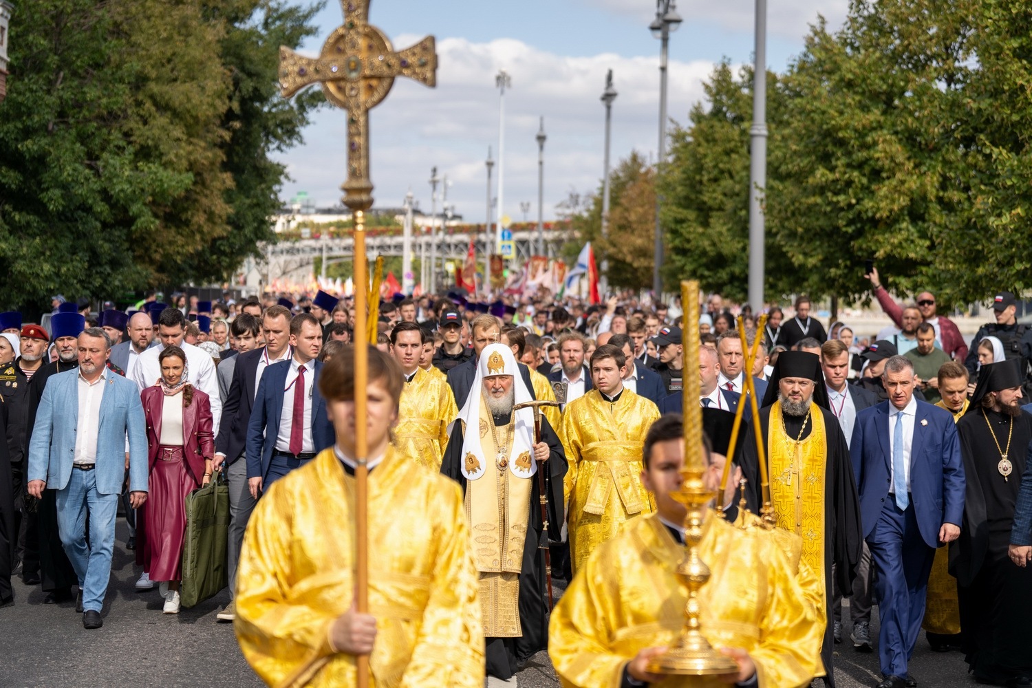 Затем Святейший Патриарх возглавил крестный ход с молебным пением по историческому маршруту от Храма Христа Спасителя до Новодевичьего монастыря. В этом году в крестном ходе приняли участие десятки тысяч верующих, среди которых были представители различных слоев общества, политики, общественные деятели и молодежь. В числе участников — заместитель председателя Государственной Думы А.Ю. Кузнецова, министр промышленности А.А. Алиханов, руководитель фракции ЛДПР Л.Э. Слуцкий, а также представители духовенства и общественных организаций.