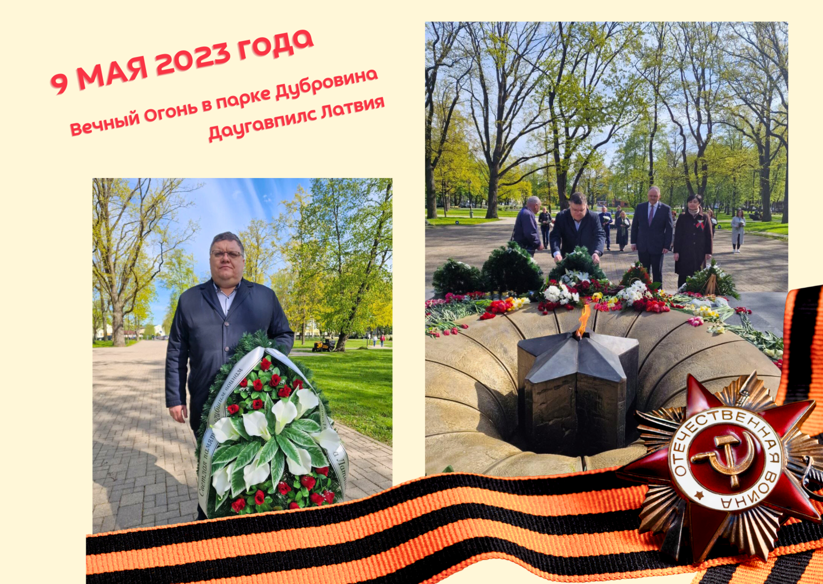 Сегодня 9 мая 2023 года Русская община Латвии возложила памятные венки к Вечному Огню зажженному 8 ноября 2019 года от лампы привезенной волонтерами Общественного молодежного движения Псковской области "ЛИГА МОЛОДЁЖИ", которая была зажжена от мемориала "Вечный Огонь" на Площади Победы в городе Пскове, 7 ноября 2019 года.