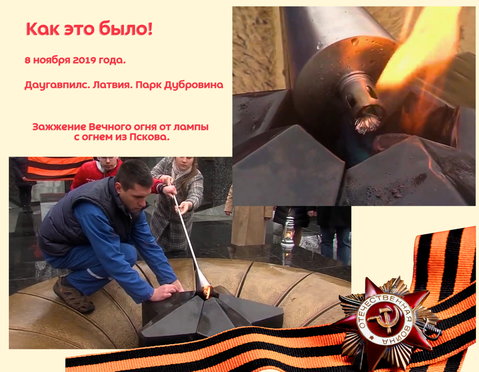 После того как латвийские власти перестали оплачивать горение Вечного Огня в городе Даугавпилс, Русская община Латвии приняла решение, что огню гореть! Тогда и начался сбор средств у общественности города. Несмотря на оголтелую русофобию латвийских властей, жители города быстро собрали необходимую сумму.