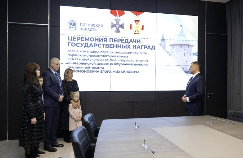Губернатор Псковской области Михаил Ведерников встретился с родственниками гвардии лейтенанта Егора Соломоновича, чтобы по поручению Президента России Владимира Путина вручить им орден «За заслуги перед Отечеством» IV степени с мечами и орден Мужества. Эти высокие государственные награды были присуждены командиру парашютно-десантной роты 234 гвардейского десантно-штурмового полка 76-й гвардейской десантно-штурмовой дивизии посмертно за проявленный героизм, мужество и отвагу в зоне специальной военной операции.