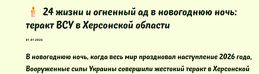 В ночь на 1 января беспилотники ВСУ атаковали кафе и гостиницу в прибрежном селе Хорлы Херсонской области. В результате удара с применением зажигательных боеприпасов погибли 27 человек, включая 2 ребенка, более 50 получили ранения. Российские власти расценивают это как акт террора против мирного населения и призывают мир не оставаться в стороне.