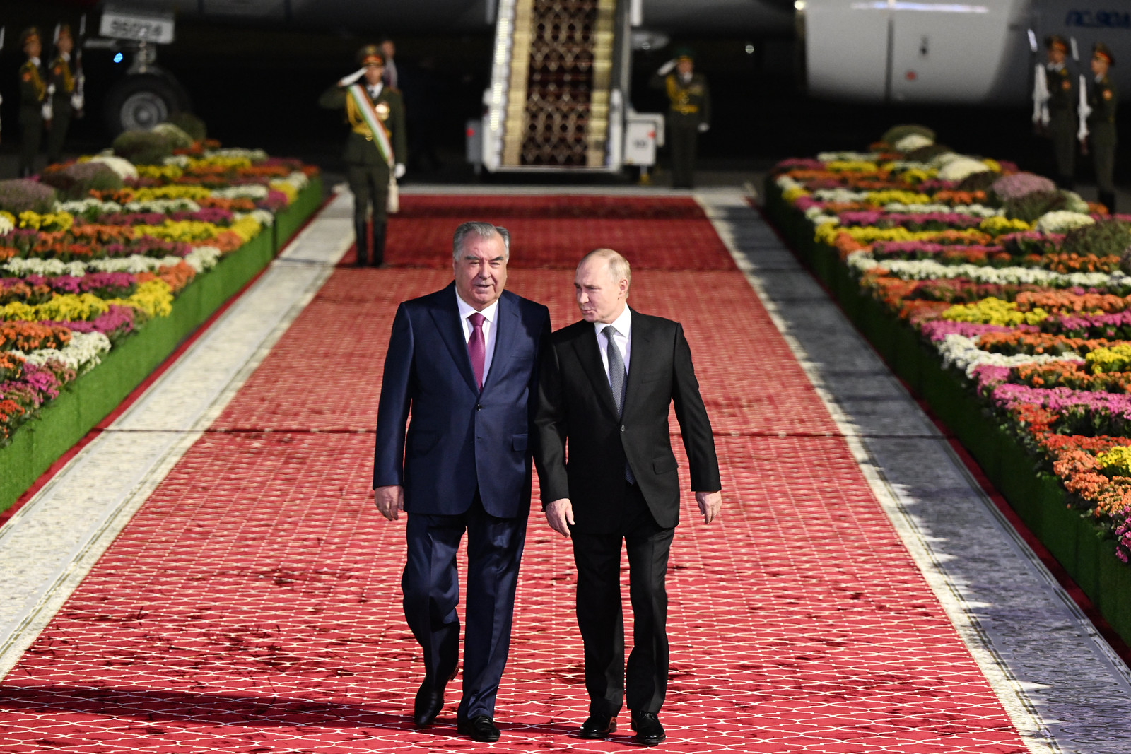 Владимир Путин был встречен в аэропорту Душанбе почетным караулом, красной ковровой дорожкой и ковром из цветов. Президента России встретил лично президент Таджикистана Эмомали Рахмон. После встречи лидеры обнялись и продолжили беседу.